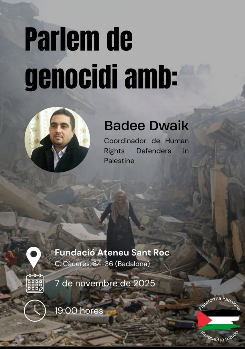 Badee Dwaik participarà en una trobada organitzada per la Plataforma Badalona contra el genocidi per parlar sobre la situació actual de Palestina, el genocidi i el tractat de pau el proper divendres 7 de novembre a l’Ateneu de Sant Roc.