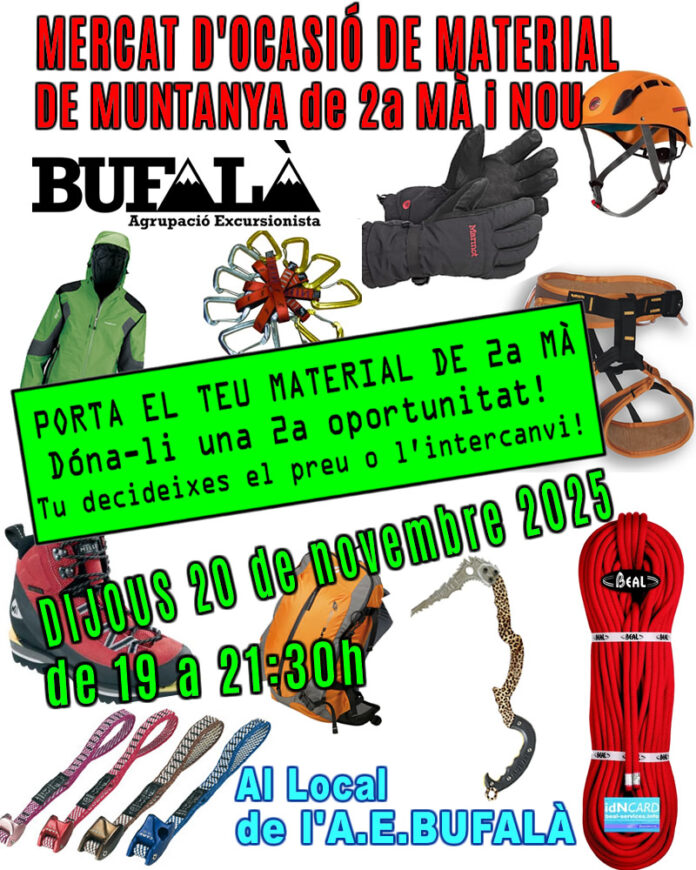 El dijous 20 de novembre, l’Agrupació Excursionista Bufalà organitza al seu local un mercat d’ocasió de material de muntanya de segona mà i nou. De 19 a 21.30 hores tothom qui vulgui podrà donar una segona vida a materials com motxilles, frontals, paravents, etc. que ja no necessiti. Es podrà posar preu o intercanviar-lo per un altre material. «La nostra entitat no posa cap tant per cent ni comissió en el cas que vulguis vendre el material, aquesta activitat la fem sense cap ànim de lucre perquè a l’Agrupació Excursionista Bufalà estem compromesos amb el medi ambient, amb les nostres muntanyes i per tant ens agrada tenir-ne cura. Tanmateix, creiem en els valors del col·lectiu de persones que realitzem qualsevol esport de muntanya», afirmen des de l’entitat.