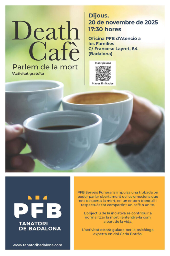 El death cafè és un format de conversa nascut als països anglosaxons que s’ha estès arreu del món amb la voluntat de normalitzar la mort com a part de la vida. En un ambient distès i de confiança, les persones participants comparteixen reflexions, vivències i inquietuds al voltant d’aquest fet universal, tot prenent un cafè o un te. “Des de PFB creiem en la importància de crear i col·laborar en activitats que ajudin a entendre i naturalitzar la mort, perquè parlar-ne obertament ens permet entendre millor aquest fet inherent a la vida, i viure amb més consciència i serenor”, afirma Ana Gassió, directora general de PFB. “Aquest serà el cinquè death cafè que impulsem, des de la primera sessió que vam organitzar el 2022. La bona rebuda que hem tingut en cada edició ens confirma que hi ha una necessitat real d’espais on poder compartir i escoltar sense prejudicis