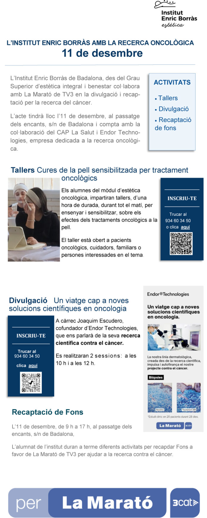 El proper dijous, 11 de desembre, els alumnes del grau superior d’estètica integral i benestar de l’Institu Enric Borràs sortiran al carrer per col·laborar amb la Marató de TV3, que enguany se centra en la divulgació i la recaptació per la recerca contra el càncer. Durant el matí es duran a terme diverses activitats al passatge dels Encants de Badalona, en col·laboració amb el CAP La Salut i l’empresa dedicada a la recerca oncològica Endor Technologies.