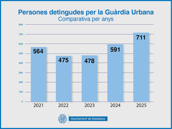 La Guàrdia Urbana de Badalona ha incrementat la pressió contra la delinqüència, tal com demostren les dades de detencions efectuades per aquest cos en els darrers anys, amb una pujada especialment destacada des de l’any 2022 i un màxim històric assolit el 2025 com a resultat del reforç de la pressió policial. Segons les dades disponibles, les detencions han passat de 475 l’any 2022 a 711 l’any 2025, un fet que suposa un augment proper al 50% en només tres anys.