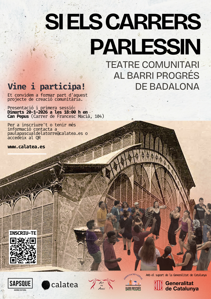 El proper dimarts 20 de gener a les 18:00h tindrà lloc a Can Pepus (Carrer de Francesc Macià, 104) la presentació de «Si els Carrers Parlessin», un projecte de teatre comunitari impulsat per Calatea, Saps Qué i Art en Acció que es desenvoluparà al barri Progrés de Badalona fins al mes de juny.