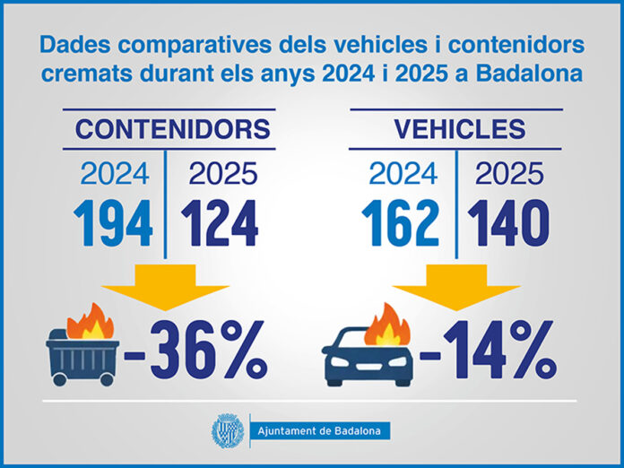 Badalona va aconseguir reduir l’any passat la crema de contenidors a la ciutat en un 36% i la de vehicles en un 14% respecte de l’any 2024, segons dades de la Guàrdia Urbana. En concret, al llarg de l’any passat van resultar afectats pel foc —majoritàriament a causa d’actes vandàlics— un total de 124 contenidors, davant dels 194 cremats l’any 2024, així com 140 vehicles, en comparació amb els 162 registrats l’any anterior. Aquestes dades consten en els indicadors de la policia local i reflecteixen una tendència clarament a la baixa.