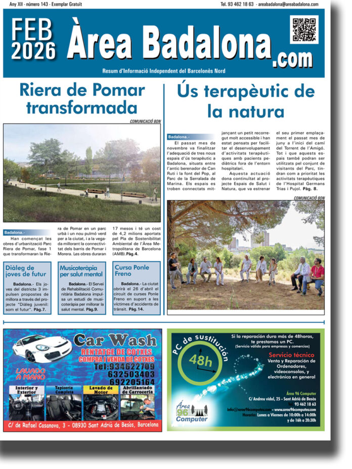 En aquest número de l’Àrea Badalona destaquem l’inici de les obres per transformar la Riera de Pomar en un parc urbà, i l’ús terapèutic de la natura en espais de la Serralada de Marina i l’Hospital de Can Ruti.