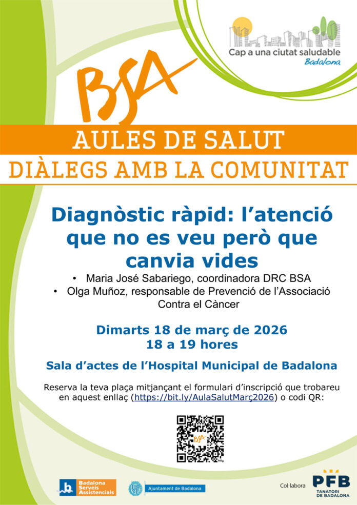 “Diagnòstic ràpid, l’atenció que no es veu però que canvia vides” serà el títol de la propera la sessió del cicle de conferències de promoció de la salut “Aules de Salut. Diàlegs amb la comunitat”, que tindrà lloc dimecres 18 de març, de 18 a 19 hores, a la sala d’actes de l’Hospital Municipal de Badalona (HMB). La sessió anirà a càrrec de Maria José Sabariego, infermera i coordinadora de l’Oficina del Diagnòstic Ràpid de Càncer (DRC) de Badalona Serveis Assistencials (BSA) i Olga Muñoz, responsable de Promoció de la salut i dels serveis de Rehabilitació de l’Associació Contra el Càncer a Barcelona. Moderarà la trobada Marta Ribó, tècnica de salut de l’Ajuntament de Badalona. Les persones que vulguin assistir-hi cal que s’hi inscriguin prèviament a través d‘aquest formulari. La xerrada, com sempre participativa, es tancarà amb un berenar saludable gràcies al suport de PFB.