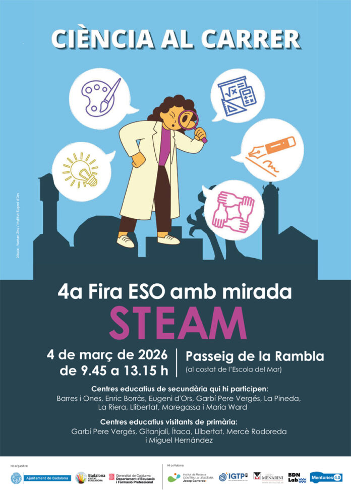 La 4a Fira de Ciència al carrer d’ESO amb mirada STEAM està organitzada pel CRP del Departament d’Educació i Formació Professional de la Generalitat de Catalunya; per l’Escola de Natura Angeleta Ferrer i l’Escola del Mar – Centre d’Estudis Marins, de l’Àrea de Medi Ambient i Sostenibilitat; i pel Servei d’Educació de l’Ajuntament de Badalona.