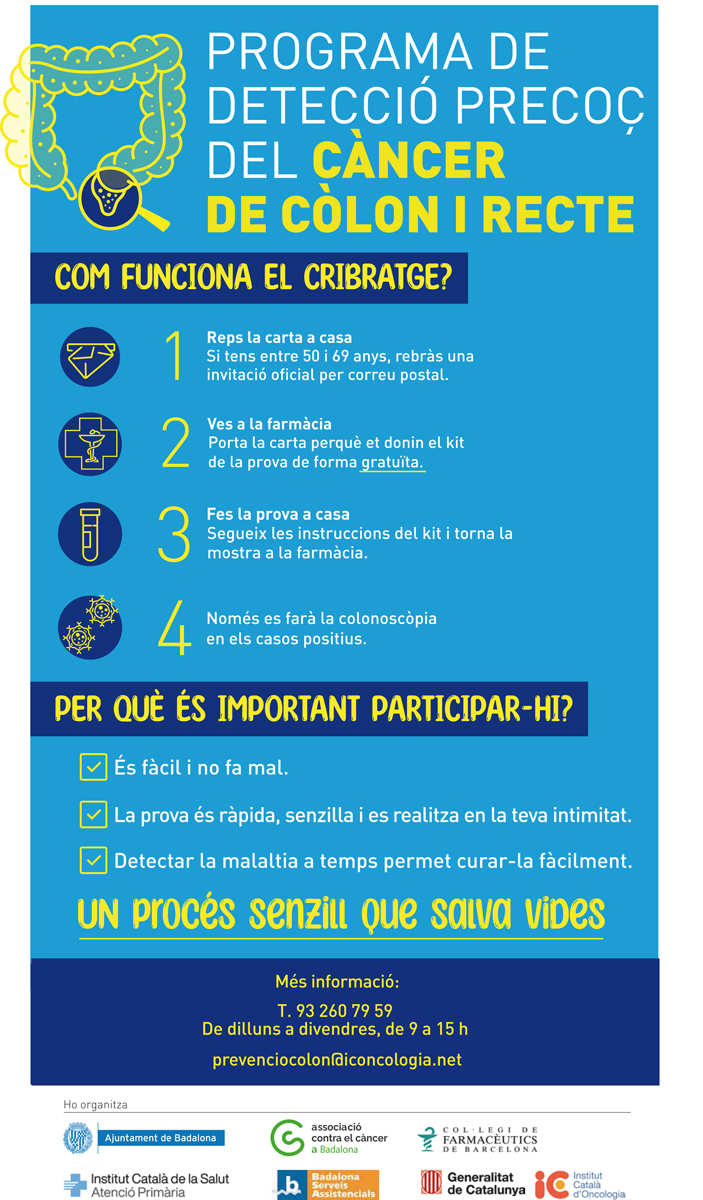El programa de cribratge s’adreça a homes i dones d’entre 50 i 69 anys, convidant-los cada dos anys a dur a terme un test de sang oculta en femta, una prova senzilla que es pot realitzar a través de les prop de 70 farmàcies col·laboradores de la ciutat. Aquesta estratègia vetlla perquè tots els veïns i veïnes tingui accés al programa de cribratge de càncer de còlon i recte minimitzant les barreres d’accés i portar la prevenció allà on és més necessària, personalitzant la intervenció a cada barri.
