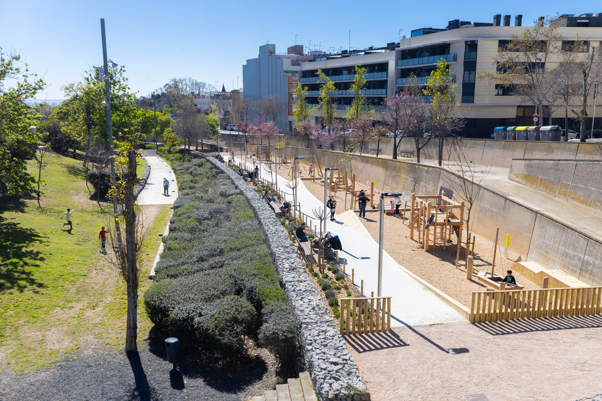 La creació d’aquesta nova àrea de jocs infantils es projecta acompanyada d’una renovació i millora de la qualitat ambiental i paisatgística, amb la substitució de la vegetació actual per 17 nous arbres, incloent-hi moreres, lledoners, roures, sòfores i arbustos sàlvia. Aquesta vegetació tindrà tres funcions vitals: millorar la biodiversitat, crear nous espais d’ombra i generar noves zones d’estada i repòs. La transformació ambiental també inclou l’aprofitament del cicle natural de l’aigua, ja que la pluja es recollirà a través de rases drenants i es conduirà fins a la riera per tal que dreni de manera natural.