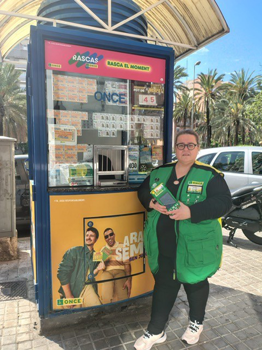 Sónia és una persona amb discapacitat, com els 2.500 agents venedors de l’ONCE a Catalunya, que ven els productes de loteria social, responsable i segura de l’Organització des del seu quiosc situat a la Plaça Trafalgar.